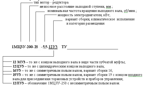 2. Мотор — редукторы1МЦ3У-160; 1МЦ3У-200; 1МЦ3У-250 с выходным валом в виде части зубчатой муфты изготавливаются по вариантам сборки 11; 12; 14; 15; 21; 22; 24; 25.